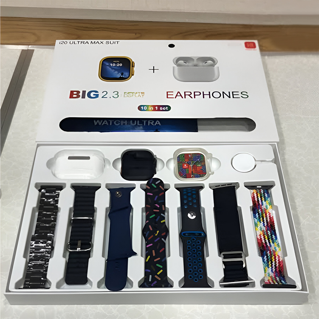 Introducing the i20 Ultra Max Suit 7 in 1 Smart Watch, a revolutionary wearable device that combines style and functionality. The package includes: – 1 x Smart Watch with 7-in-1 functionality – 7 x Interchangeable straps (color options: black, Silver, Golden, Golden + Red, Black + Navy Blue, Silver + Yellow, Silver + Green) – 1 x Pair of Bluetooth Earbuds for hands-free calls and music streaming This versatile smart watch features a 7-in-1 design, offering a range of features: – Time and date display – Game mode – Heart rate monitoring – Blood oxygen level monitoring – Step tracking and pedometer – Notifications for calls, texts, Whatsapp, Facebook, and social media – Music control and playback – Sedentary reminder and alarm